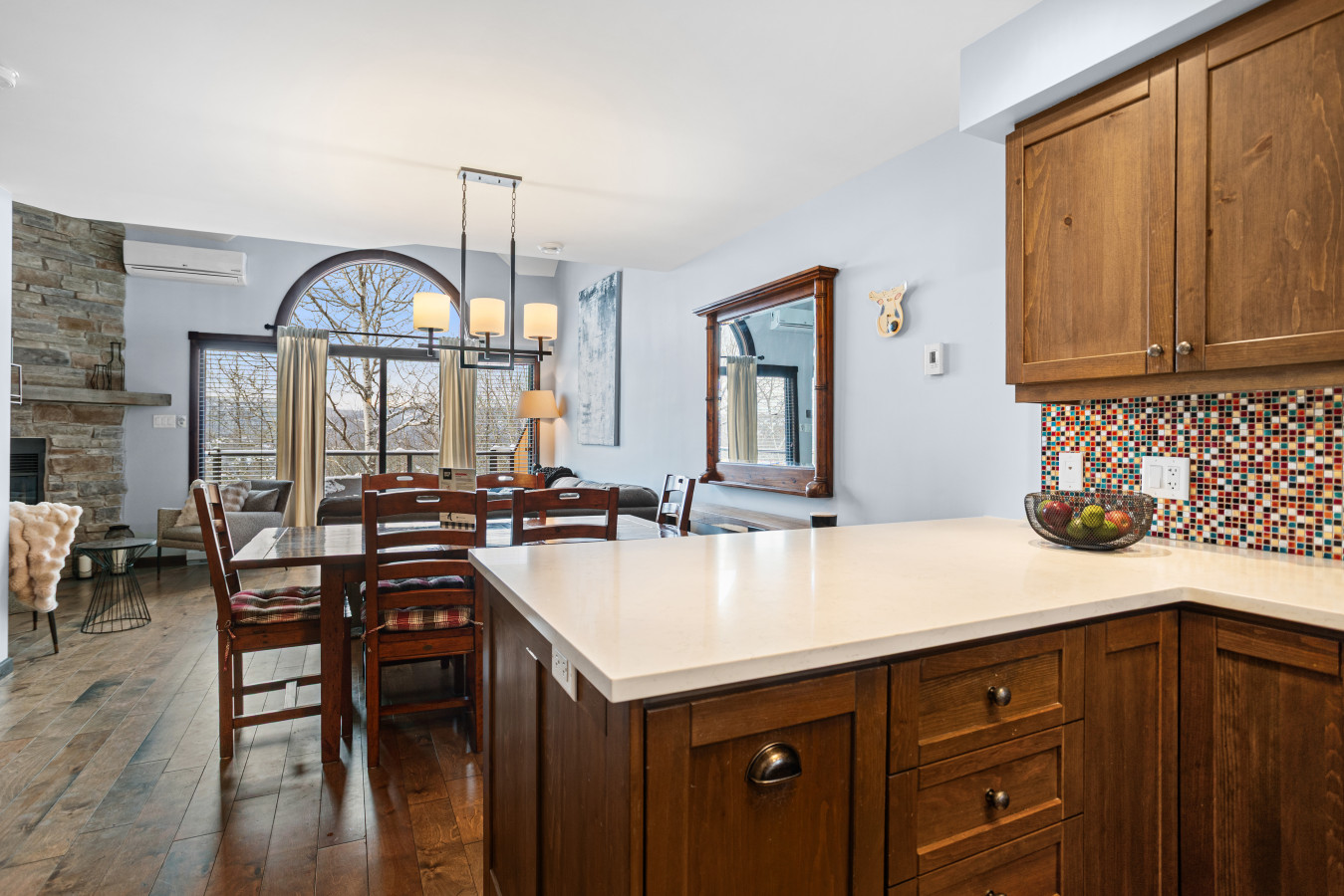 Perched above the resort and surrounded by nature, the condo provides breathtaking surroundings, direct outdoor access, and a refined yet cozy mountain atmosphere — ideal for families or groups looking to experience Tremblant at its best.