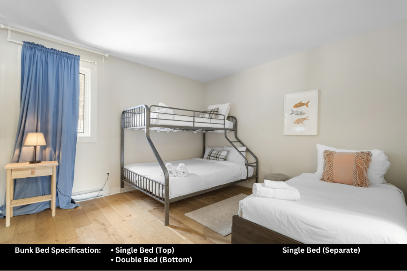Bedroom 1: 1 queen bed / Bedroom 2: 1 bunk bed (double bed bottom and single top) + 1 single bed / Living Room: sofa bed / Safe and clean stay : All bedding is washed in industrial machines at high temperature and then pressed.