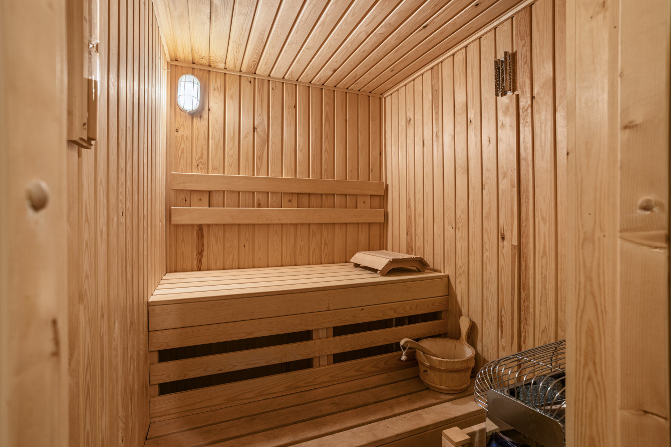 Bedroom 1 (Primary): King bed + ensuite bathroom with private sauna