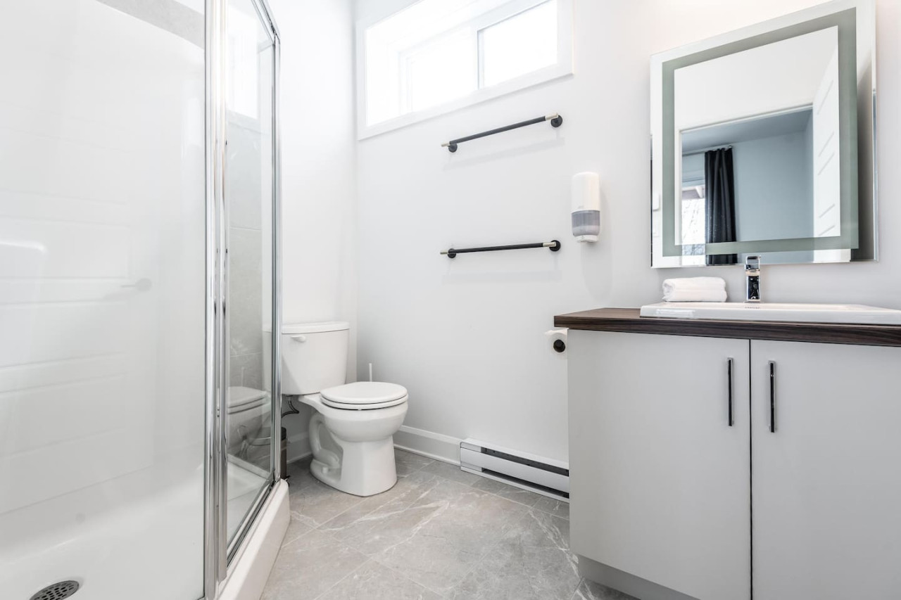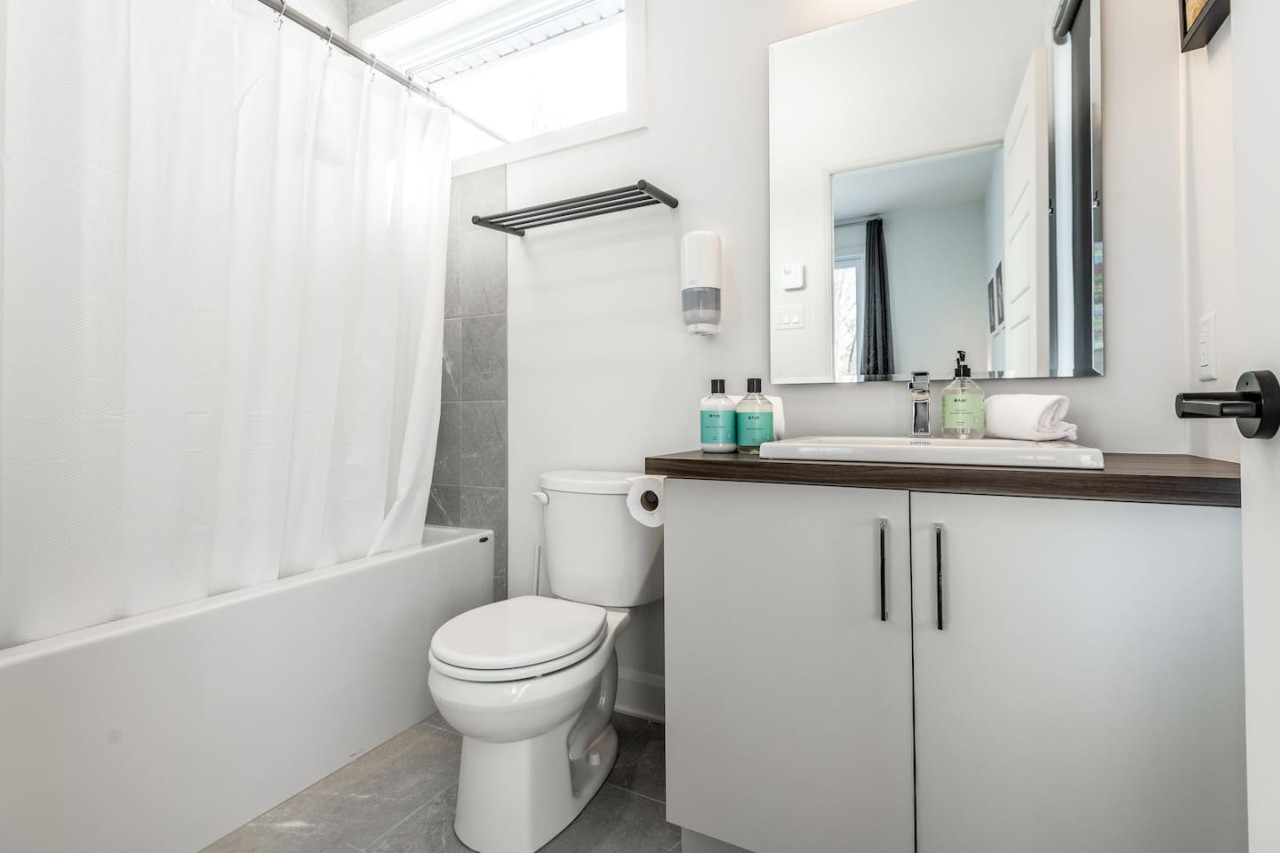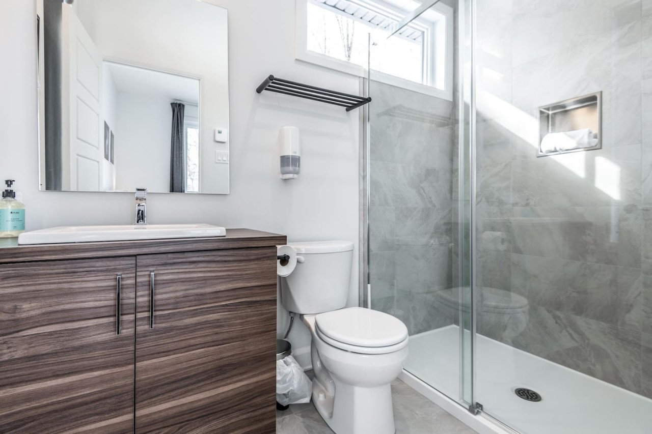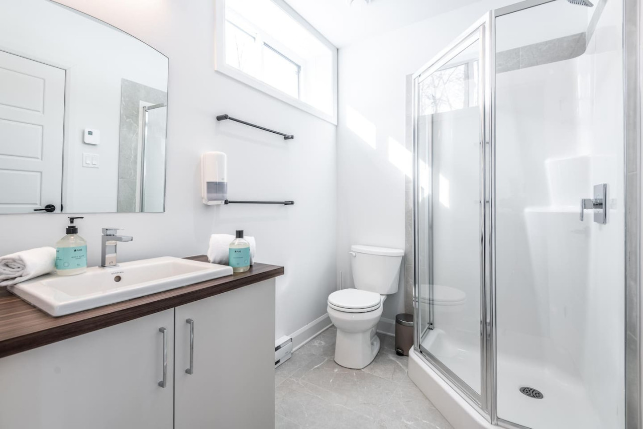 On the main floor you have 2 queen bedrooms each with its own en-suite bathroom. On the lower level you will find 2 more queen bedrooms each with its own en-suite bathroom.