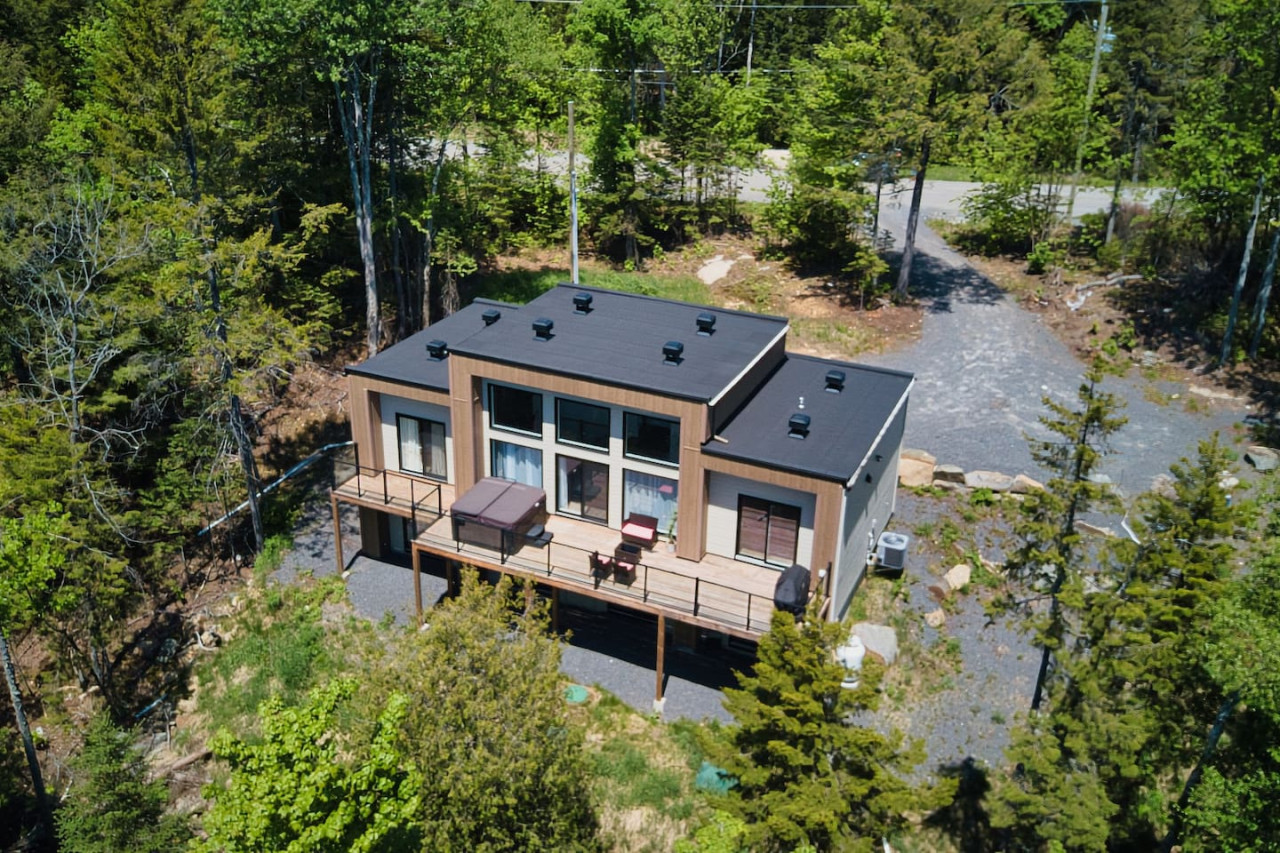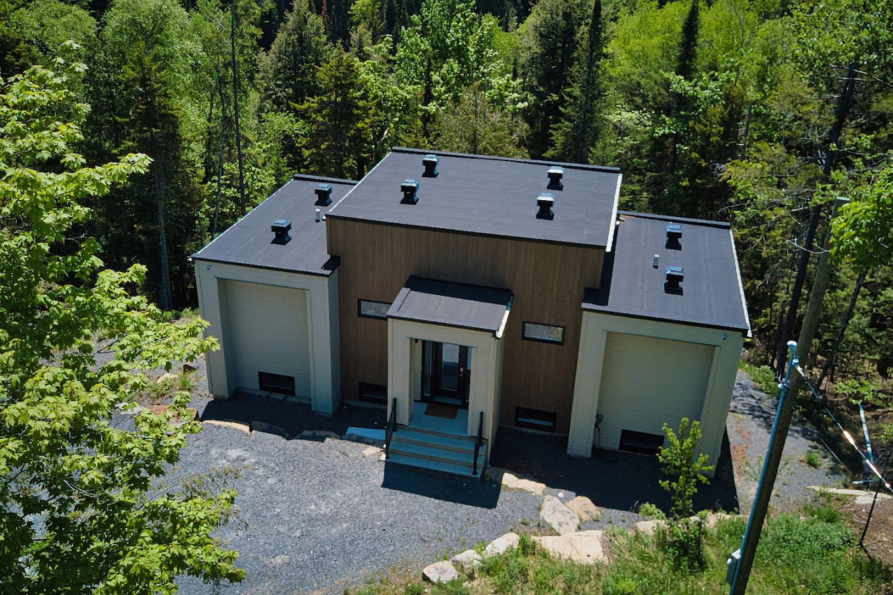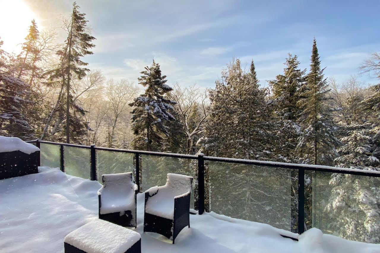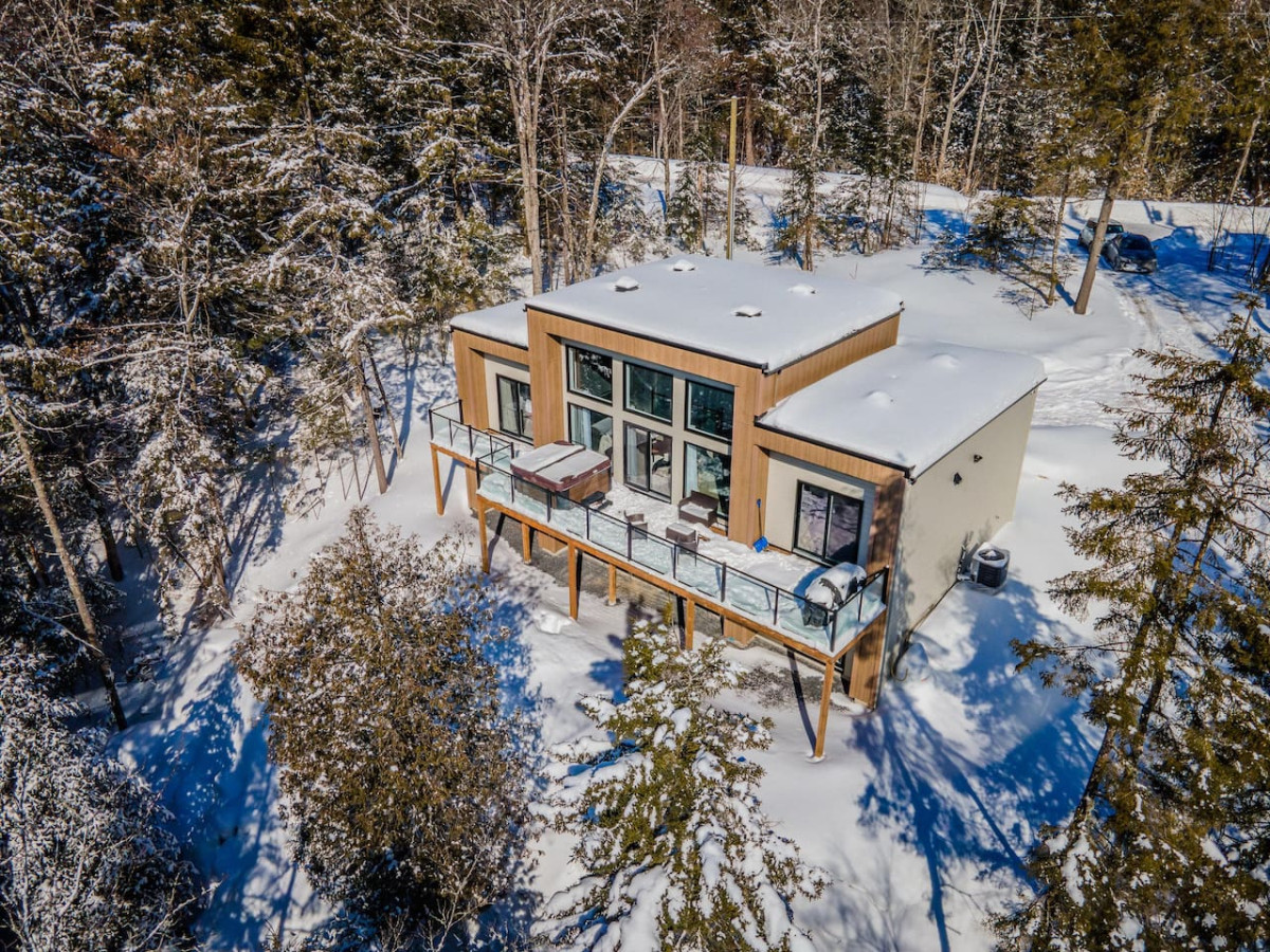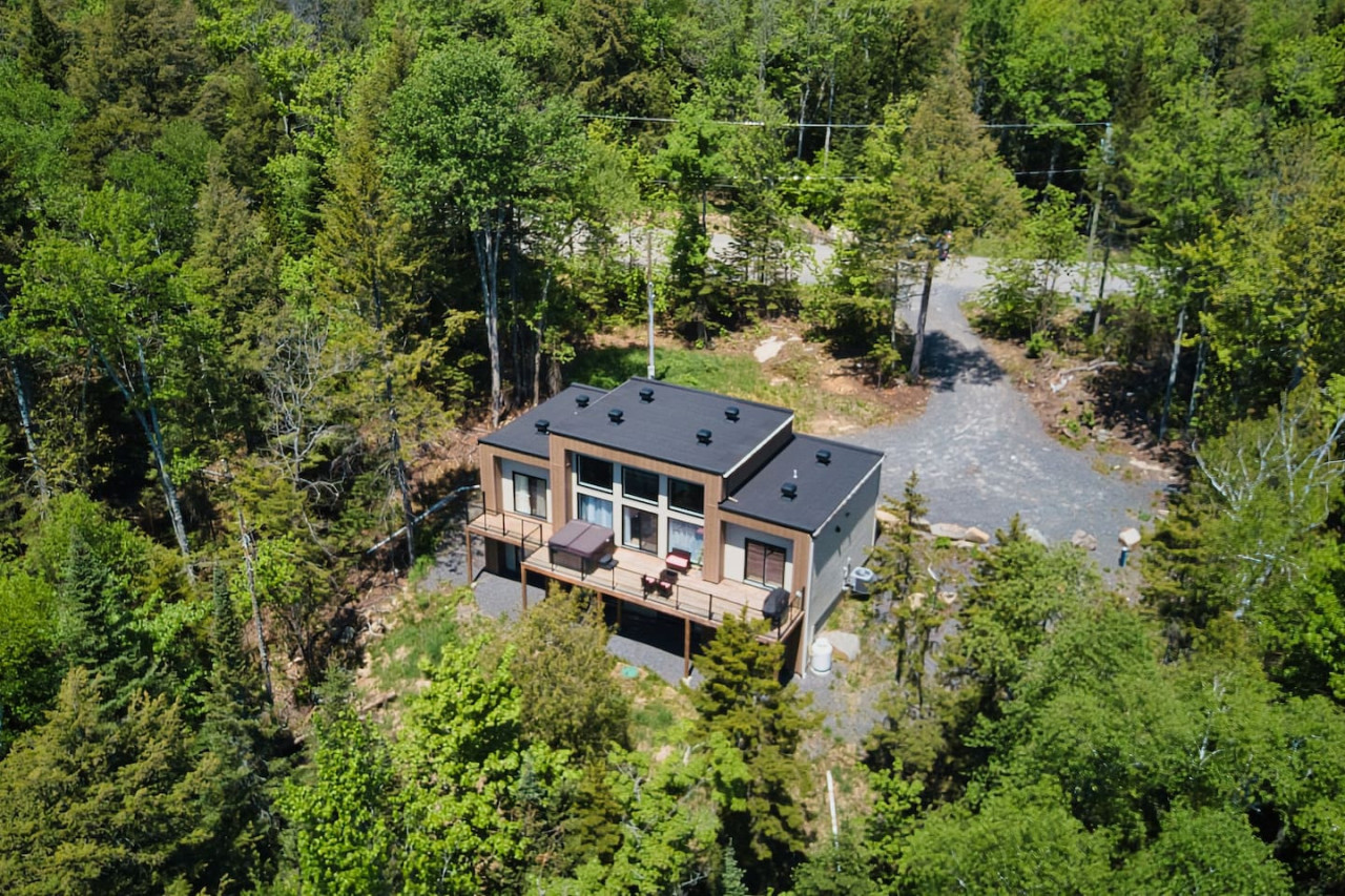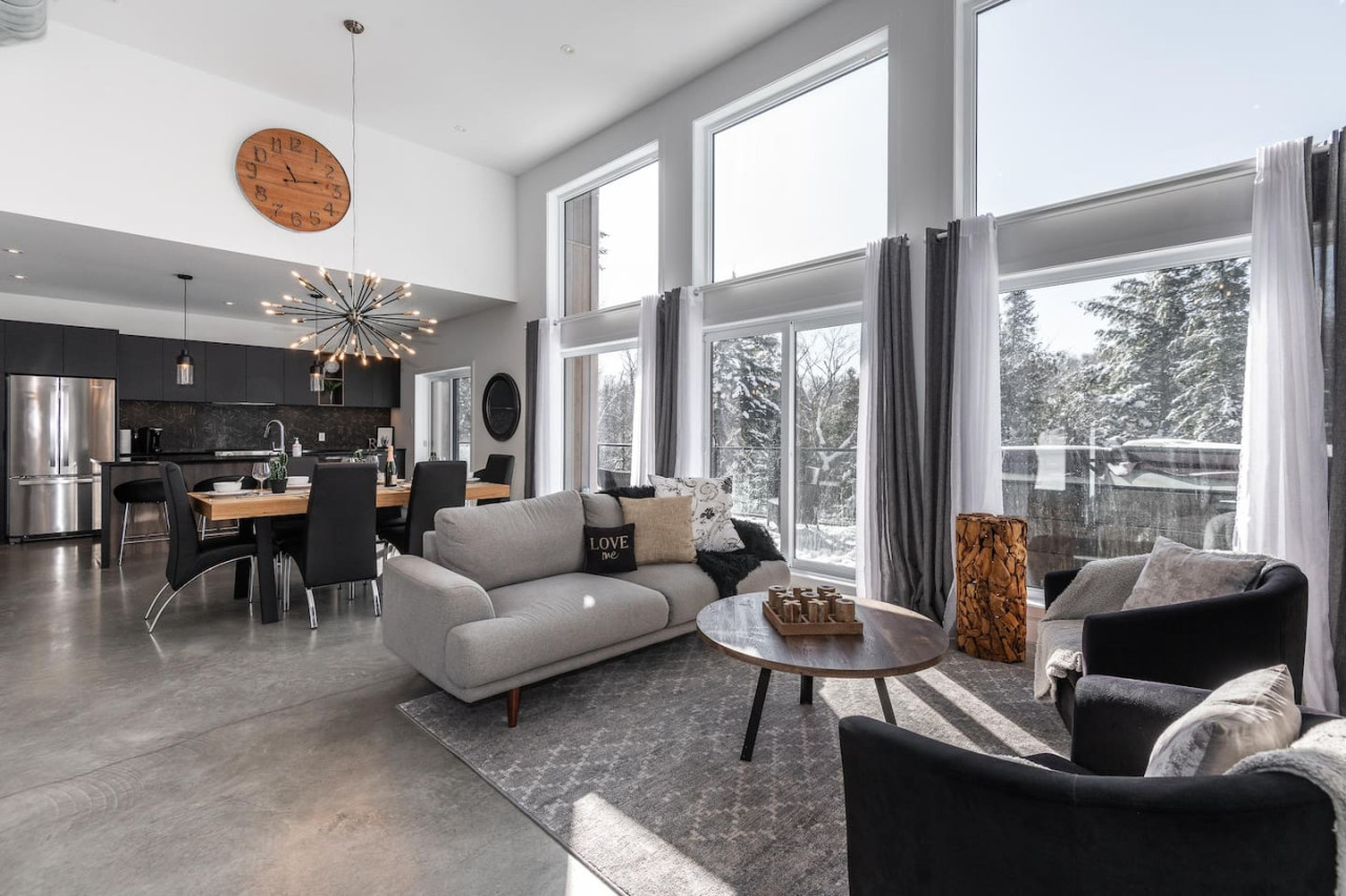 Beautifully surrounded by forest, Lodge Sky is a spacious modern chalet that spans garden level and ground floor. Ideally located in private area, 15 minutes away from Mont Tremblant.