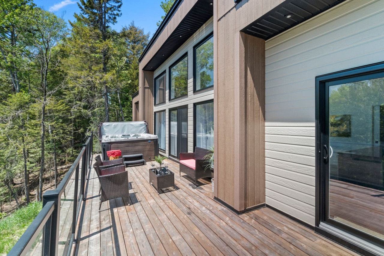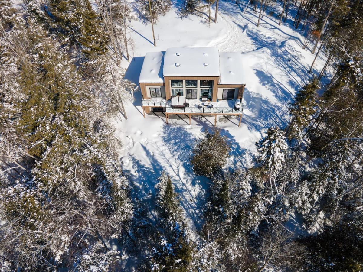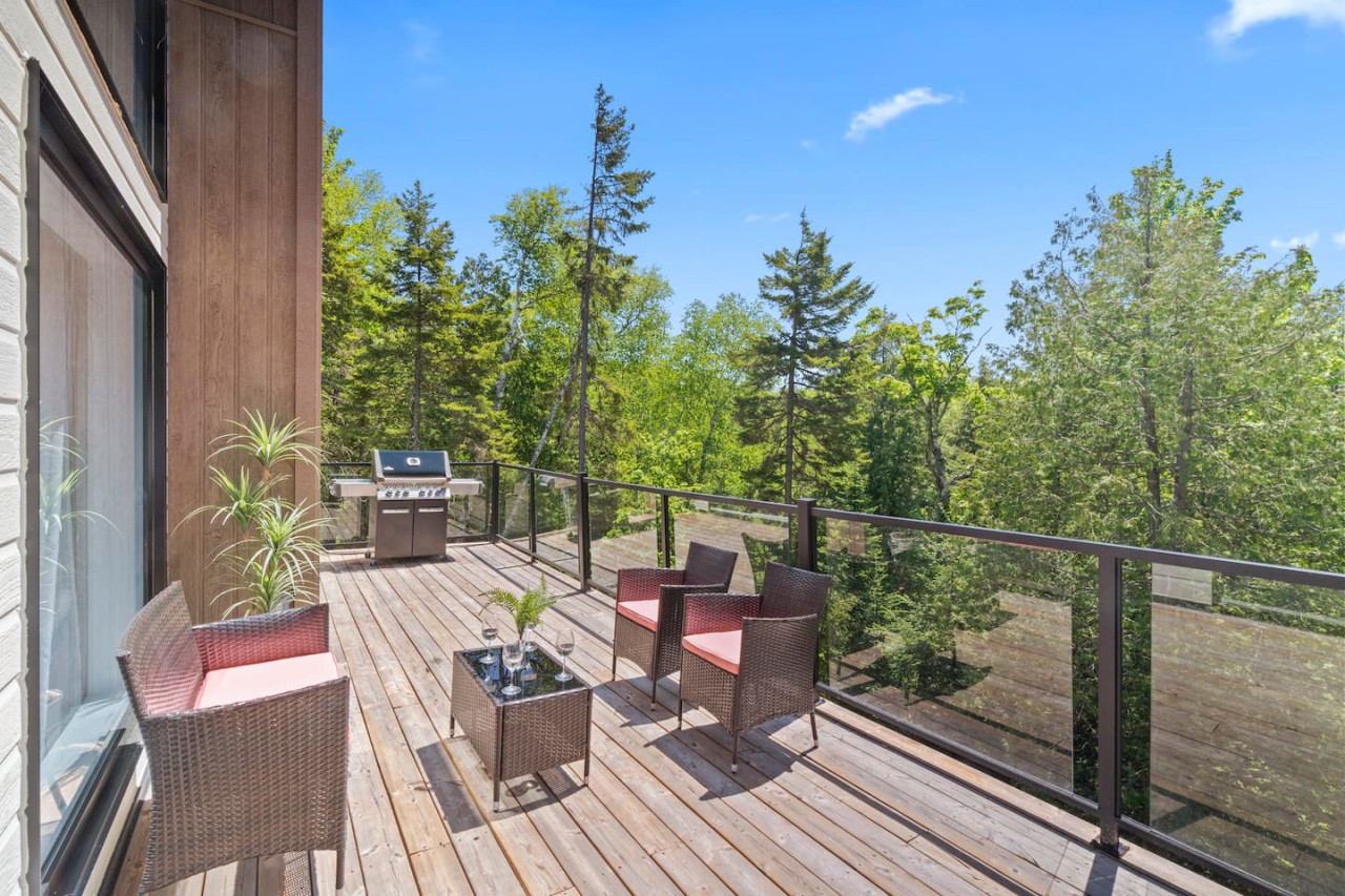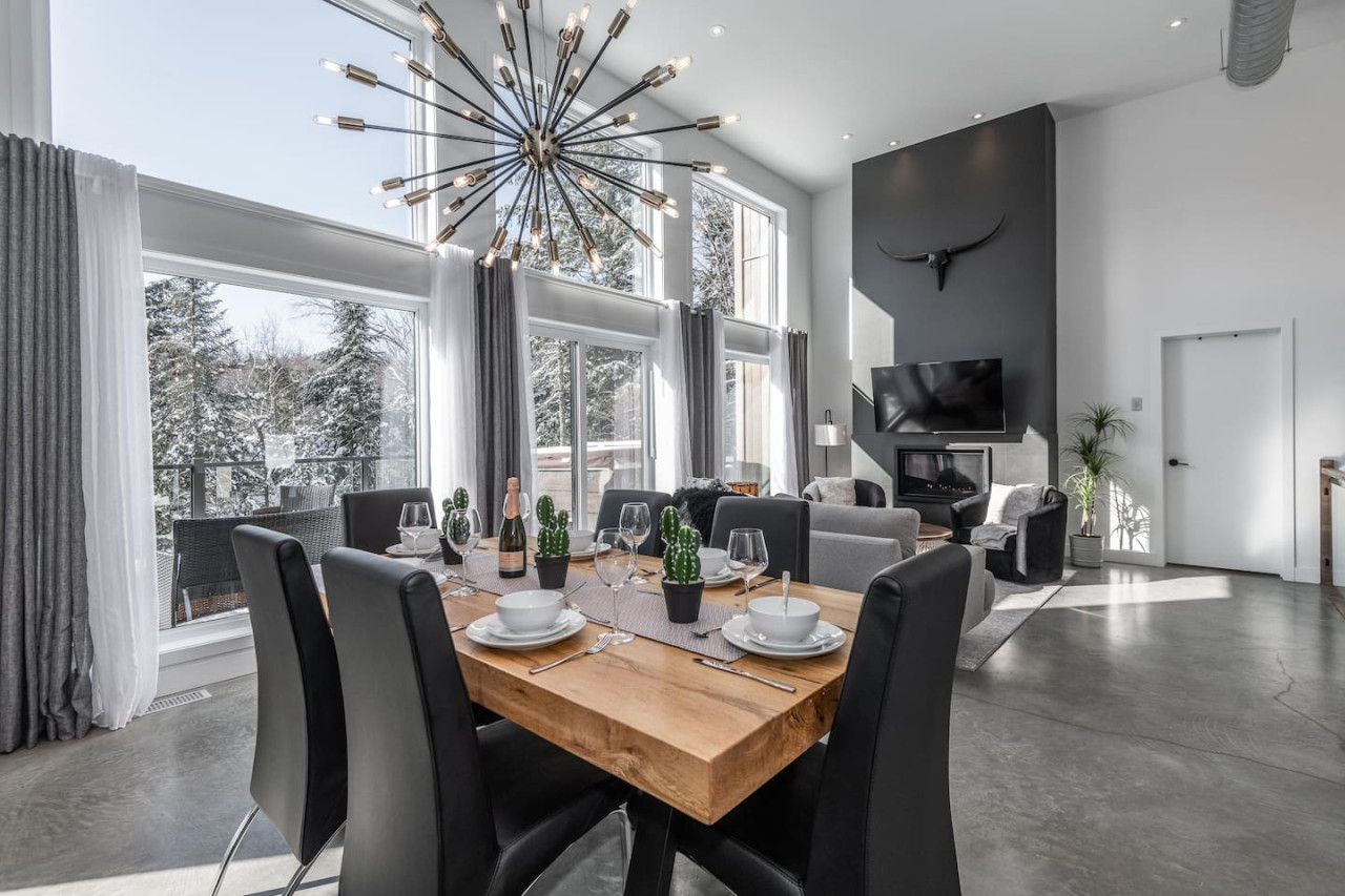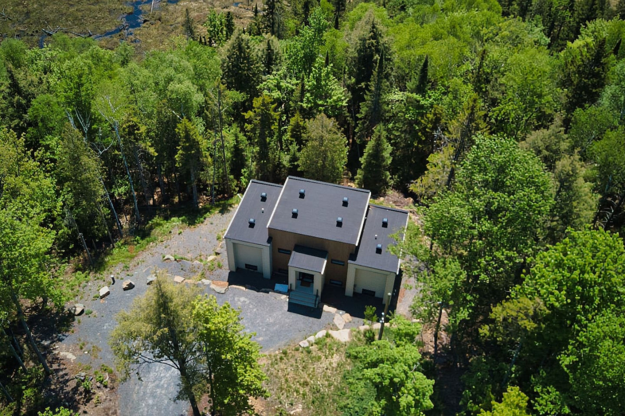 Beautifully surrounded by forest, Lodge Sky is a spacious modern chalet that spans garden level and ground floor. Ideally located in private area, 15 minutes away from Mont Tremblant.