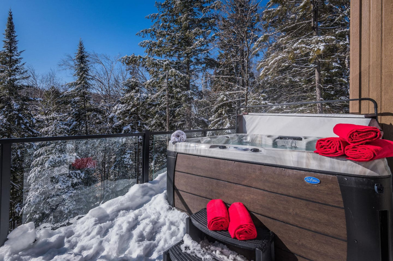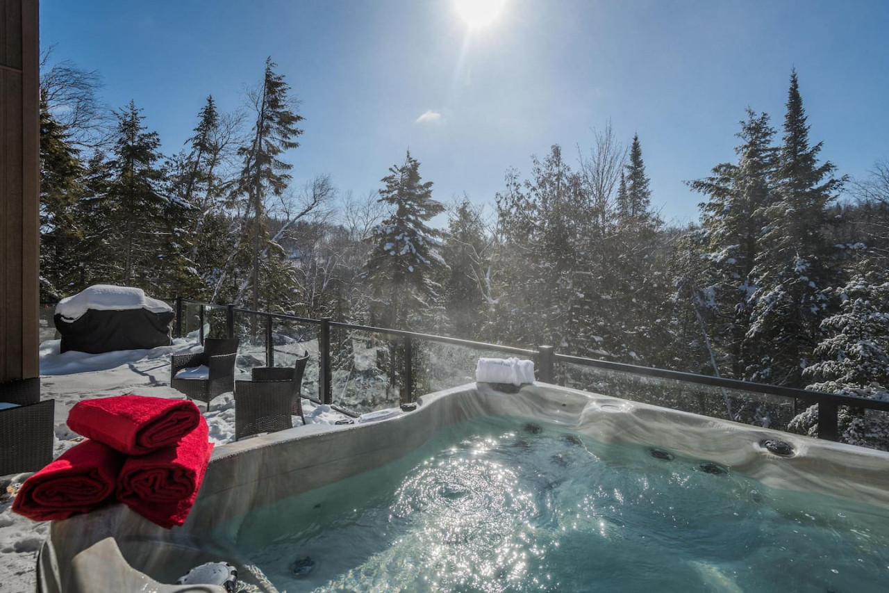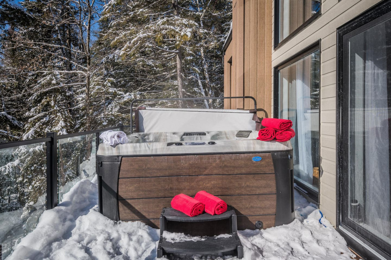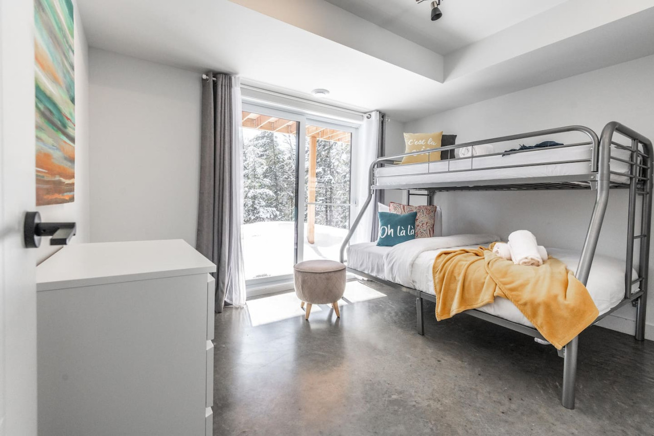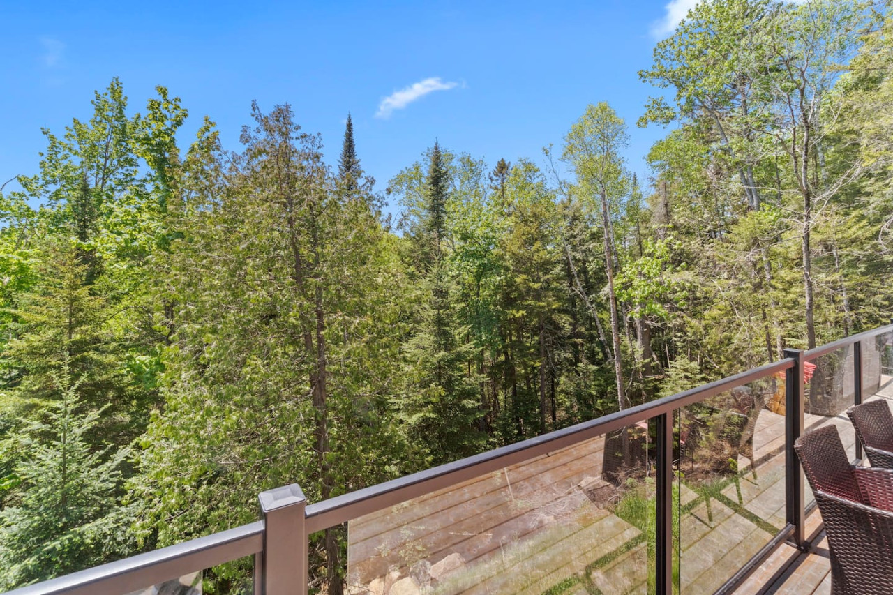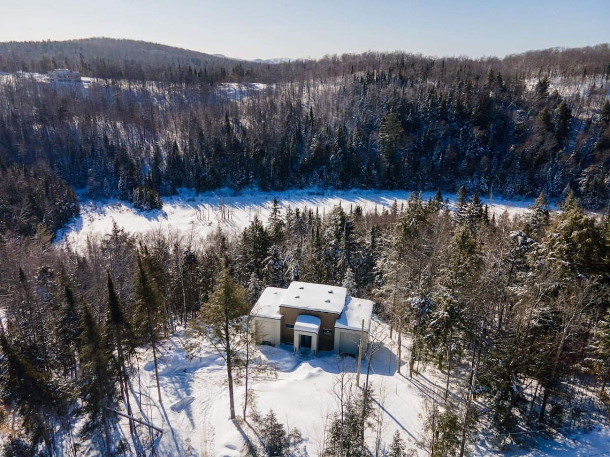 Beautifully surrounded by forest, Lodge Sky is a spacious modern chalet that spans garden level and ground floor. Ideally located in private area, 15 minutes away from Mont Tremblant.