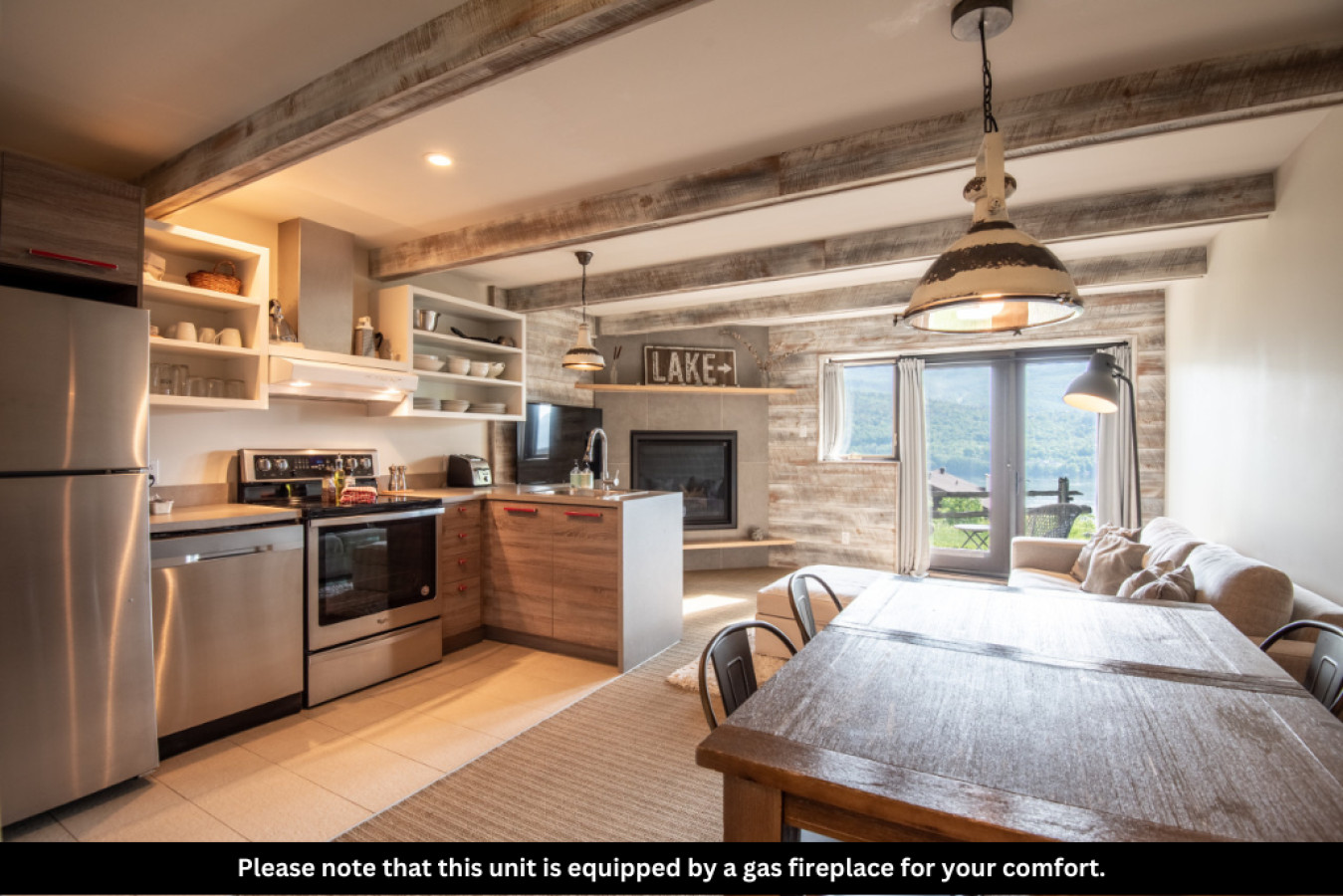 Entirely renovated 1 bedroom with view of Lake Tremblant and Mont-Tremblant! Sleeps 4 with a separate bedroom with queen bed and a sofa bed in the living room. Perfect for a couple or a small family.